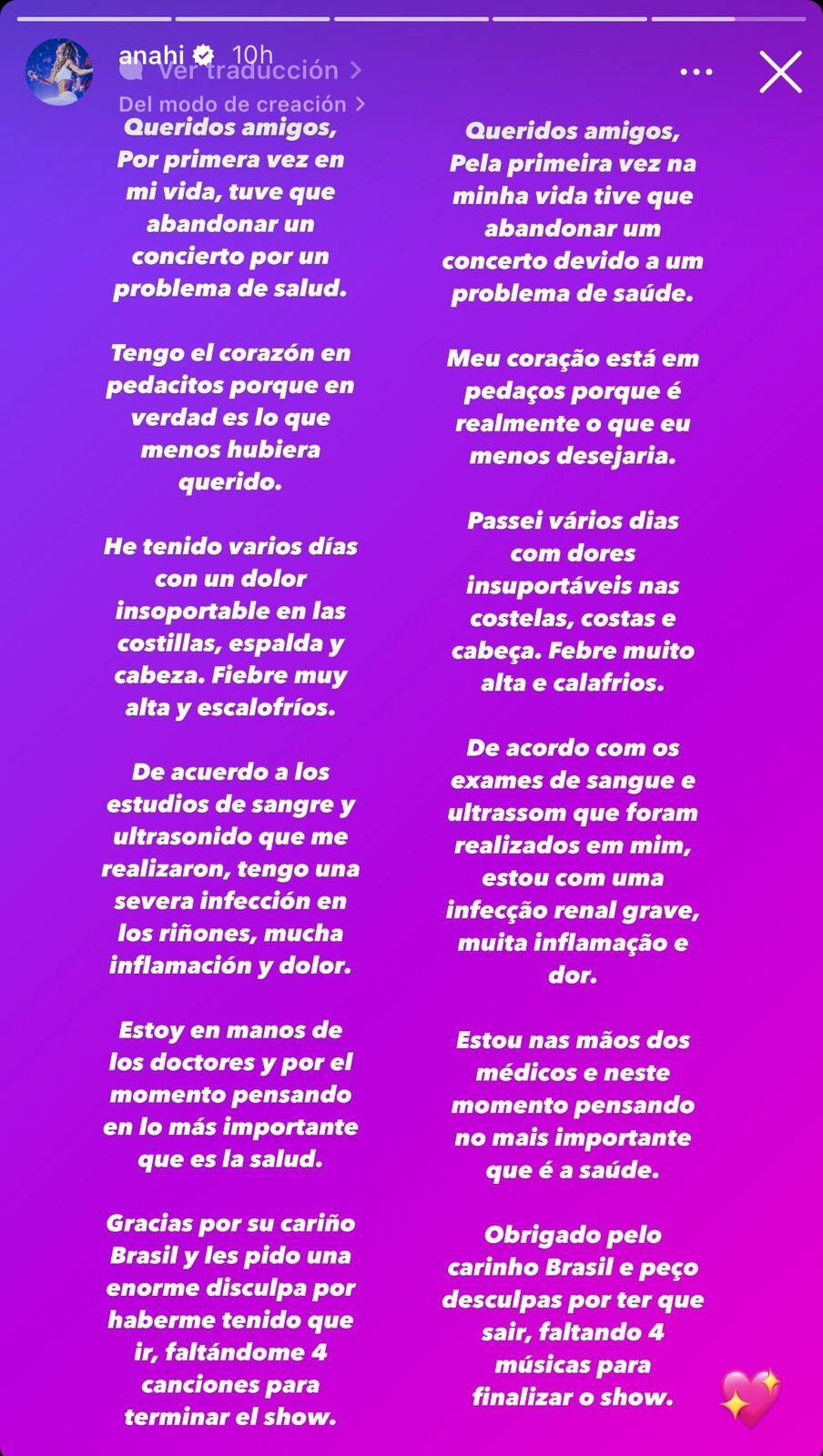 “Queridos amigos, Por primera vez en mi vida, tuve que abandonar un concierto por un problema de salud. He tenido varios días con un dolor insoportable en las costillas, espalda y cabeza. Fiebre muy alta y escalofríos. De acuerdo con los estudios de sangre y ultrasonido que me realizaron, tengo una severa infección en los riñones, mucha inflamación y dolor. Estoy en manos de los doctores y por el momento pensando en lo más importante que es la salud”, escribió Anahí en redes sociales.