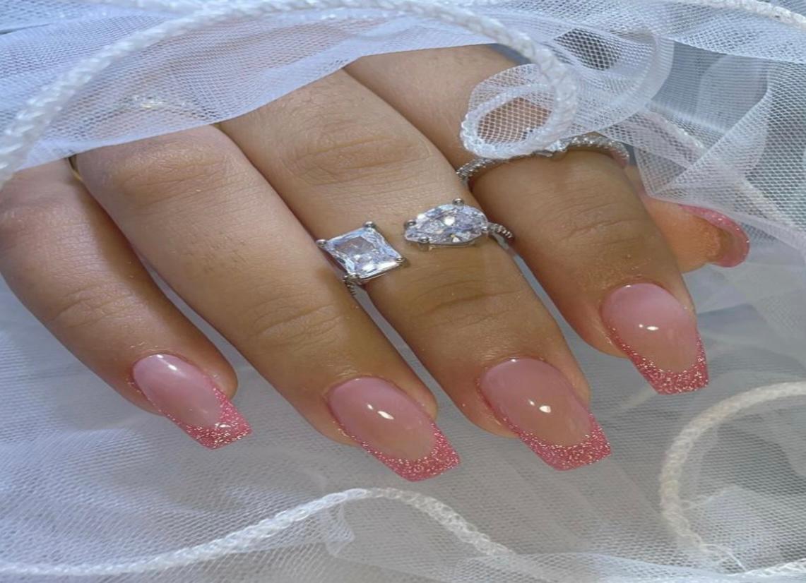 Una variación moderna de la manicura francesa: base rosa y tips brillantes. Ideal para un look dulce con un toque glamoroso.