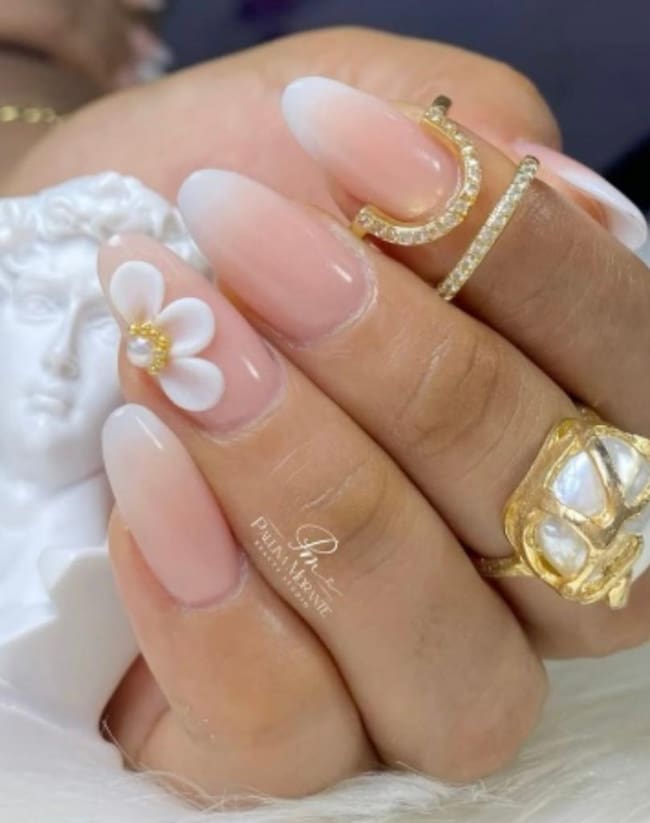 Flores tridimensionales sobre base blanca o nude, como las vistas en cuentas de Instagram, añaden un toque ultra femenino.