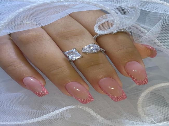 Una variación moderna de la manicura francesa: base rosa y tips brillantes. Ideal para un look dulce con un toque glamoroso.