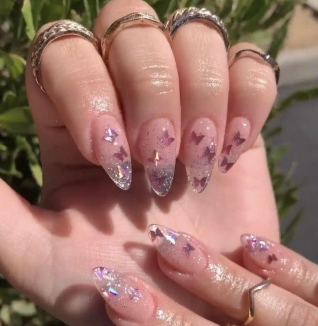 Acrílicos con detalles de mariposa combinados con tonos suaves.