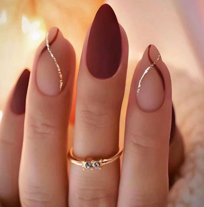 Las uñas en borgoña oscuro, con un toque de brillo o metalizado, proyectan elegancia y madurez.