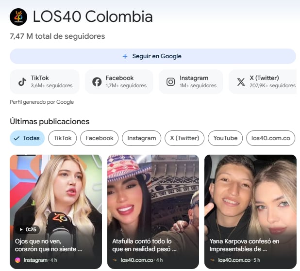 También puedes seguir a Los40 dando clic aquí. En este "perfil" encontrarás toda nuestra información, incluidos nuestros perfiles de redes sociales, y las últimas publicaciones de todas nuestras plataformas; deberás darle clic en el botón 'Seguir en Google' y de esta manera podrás ver las últimas noticias con mayor frecuencia en tu feed.