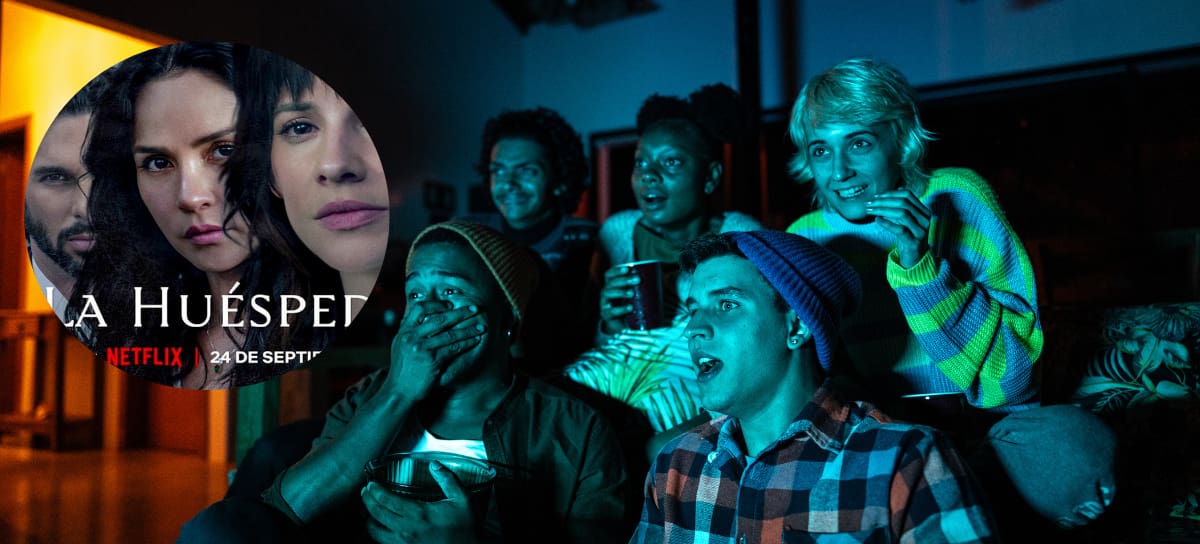 Serie La Huésped / Grupo de amigos viendo una serie de suspenso (créditos: Netflix / GettyImages)