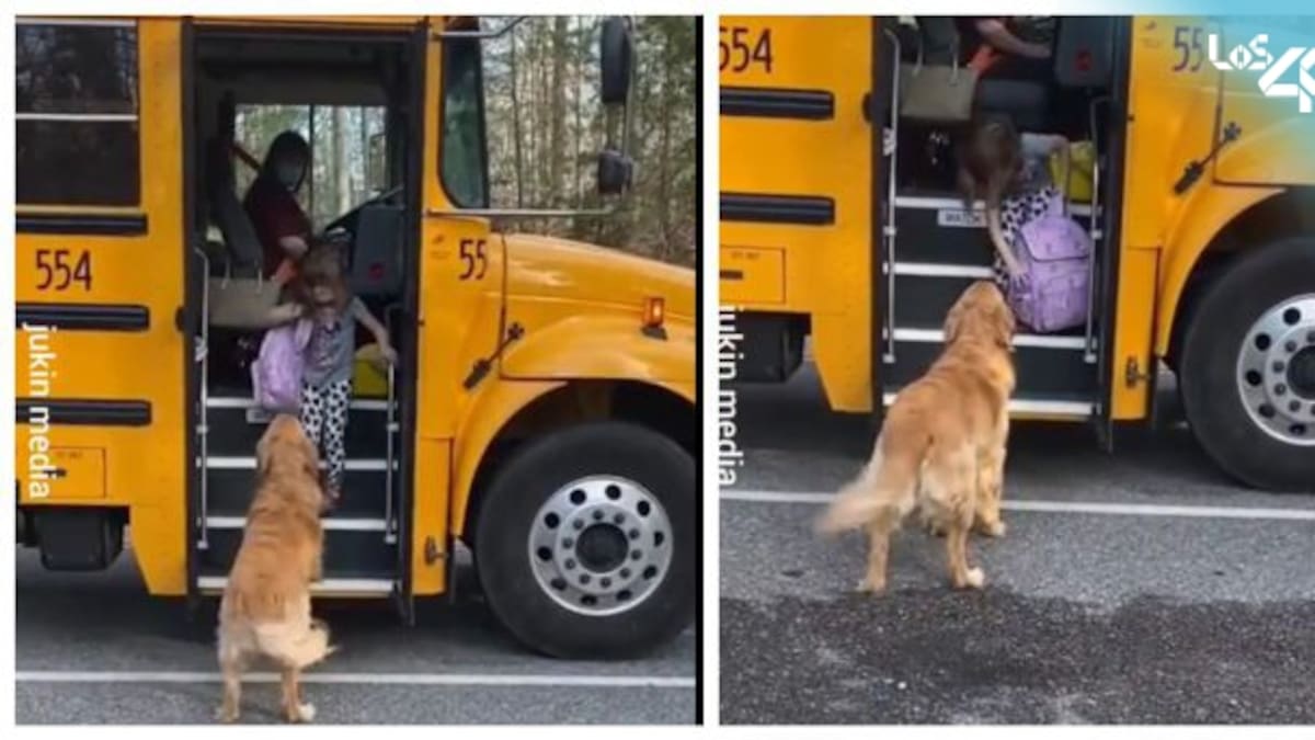 Este peludo espera paciente a que su pequeña ama regrese de la escuela para ayudarla con su mochila