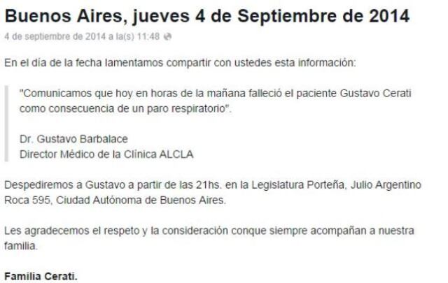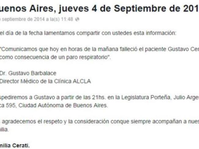 Tras un comunicado hecho por la familia de Gustavo Cerati, a través de Facebook, se ha confirmado la muerte del cantante argentino debido a un paro respiratorio sufrido en la mañana del 4 de septiembre.