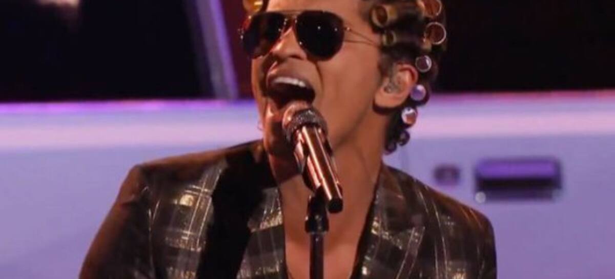 Bruno realizó junto a Mark Ronson, el performance del tema Uptown Funk luciendo en la cabeza los rollos que inevitablemente nos recuerdan a los usados por Doña Florinda en El Chavo del 8.