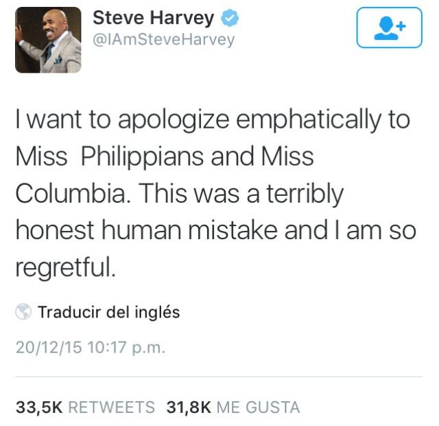Minutos después el presentador se disculpó de manera formal por Twitter en donde dejó claro que se sentía terrible por haber confundido los resultados. “Me gustaría pedir disculpas de todo corazón a la señorita Colombia y Miss Filipinas para mi gran error”.