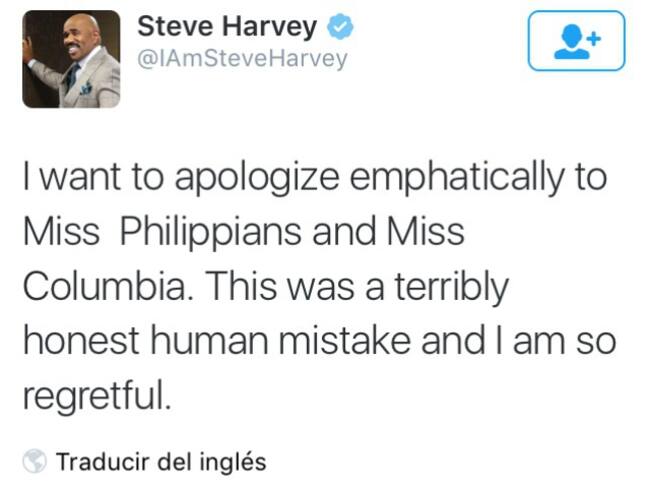 A penas se terminó el certamen de belleza, Harvey se disculpó por Twitter conun tuit en donde se disculpaba con Miss Filipinas y Miss Colombia, con lo que no contaba era que habia escrito mal el nombre de nuestro país, pues según él es 'COLUMBIA'. Este trino fue borrado a los 30 minutos de haber sido posteado, pero aquí tenemos la evidencia.