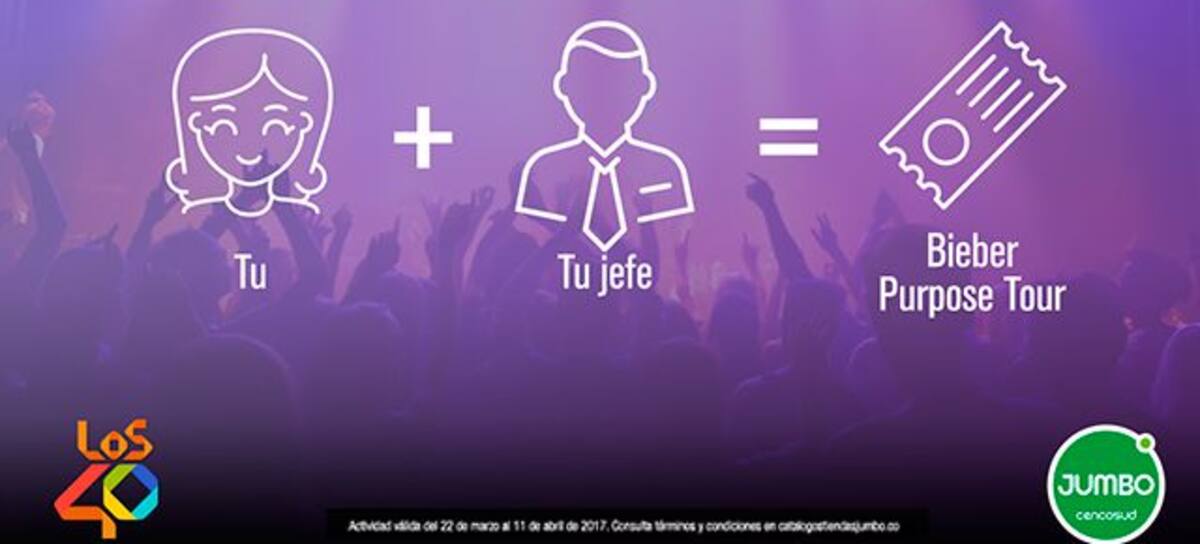 3. Publícalo en el muro en Facebook de Tiendas Jumbo Colombia, etiqueta a los 40 principales, utilizando hashtag #JumboBeliebers y el hashtag #LaPropuesta y escribe por qué quieres ir al concierto.