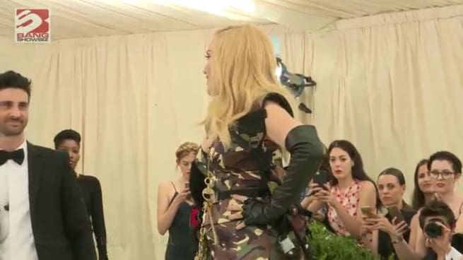 Si el año pasado dejó a todo el mundo boquiabierto con un revelador vestido que dejaba entrever la forma de sus pechos, este año la ambición rubia hizo acto de presencia en la alfombra roja de la gala con un ajustado vestido que llamaba la atención por su estampado de camuflaje.
