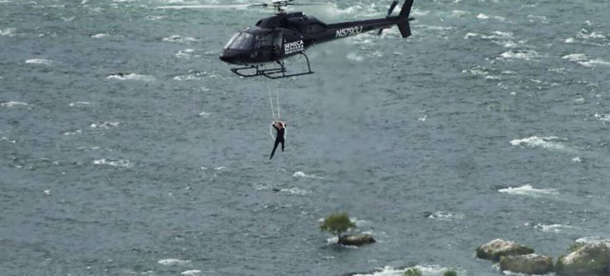 Erendira Wallenda, equilibrista y esposa del temerario Nik Wallenda, se colgó de los dientes sobre las Cataratas del Niagara, suspendida con unos cables atados a un helicóptero, logrando la acrobacia exitosamente cinco años después de que su esposo caminó sobre la cuerda floja encima de las cataratas.