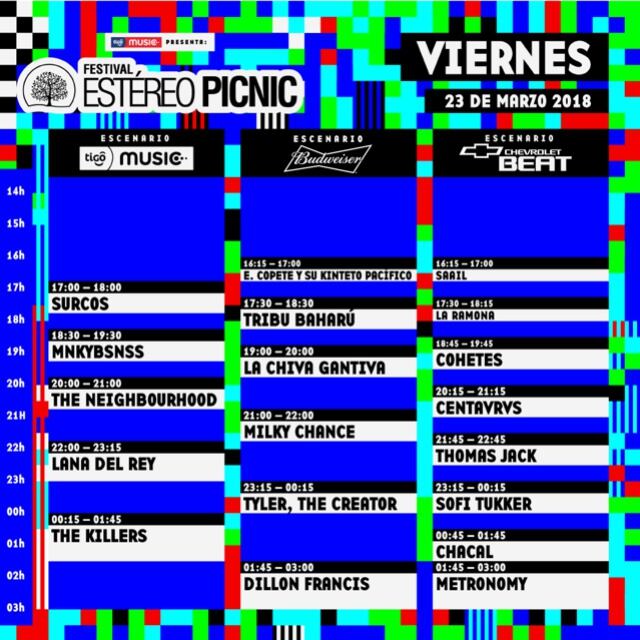El día viernes tendremos las presentaciones de The Killers, Lana Del Rey y Milky Chance y estos son los horarios en los que se presentarán todos los artistas: