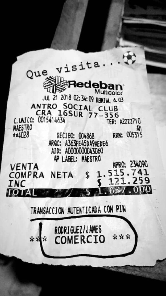 Lo más curioso de esta visita fue la cuenta que pagó: más de un millón y medio de pesos fue la cuenta que pagó el 10 de la selección Colombia. Así quedó registrado en una factura.