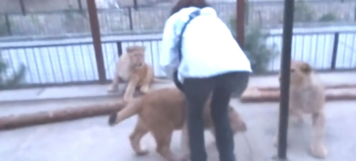 En el video se logra apreciar a la mujer que ingresó a la jaula de leones, acarició a uno de los felinos, de inmediato, otros depredadores se acercaron para darle una violenta bienvenida.