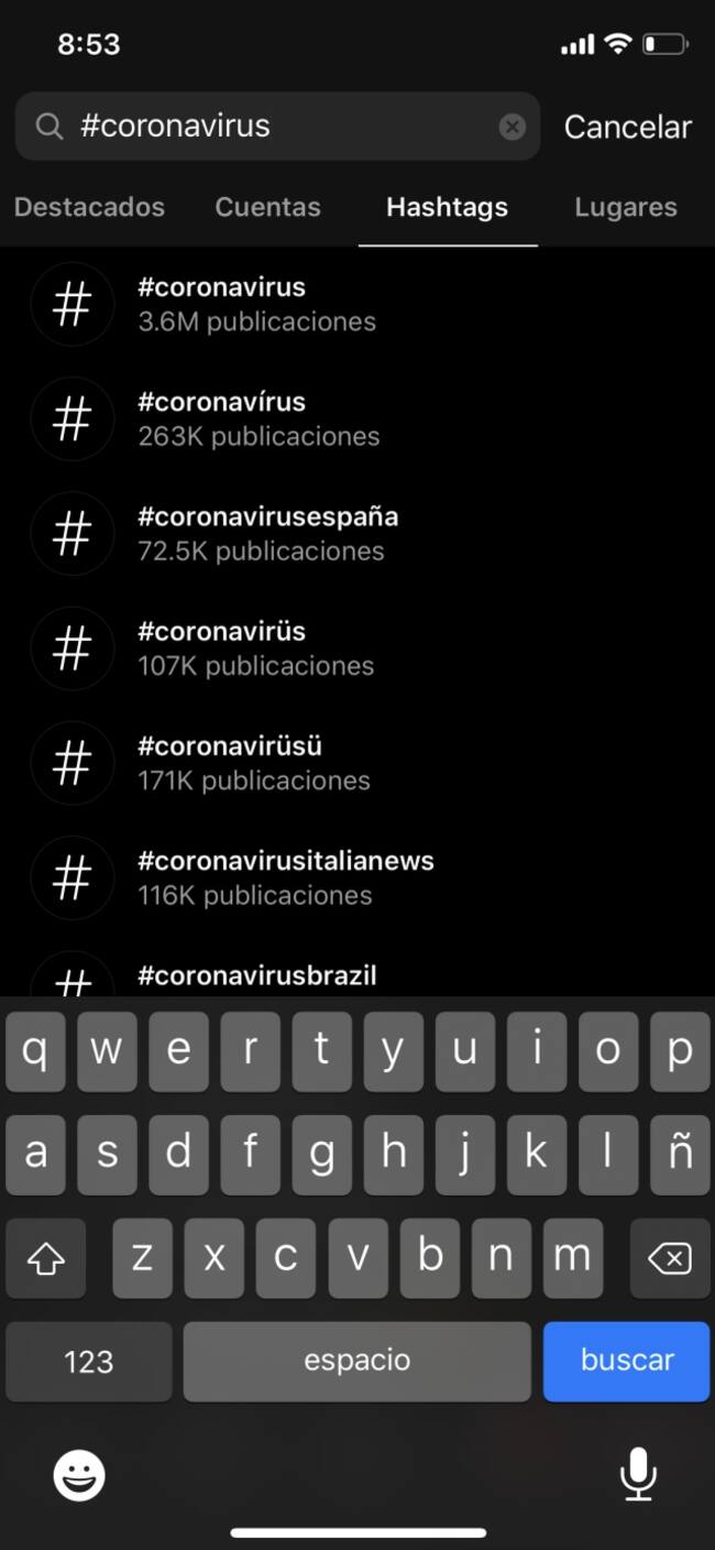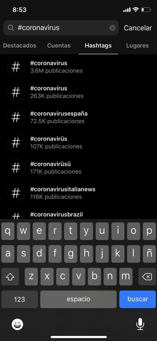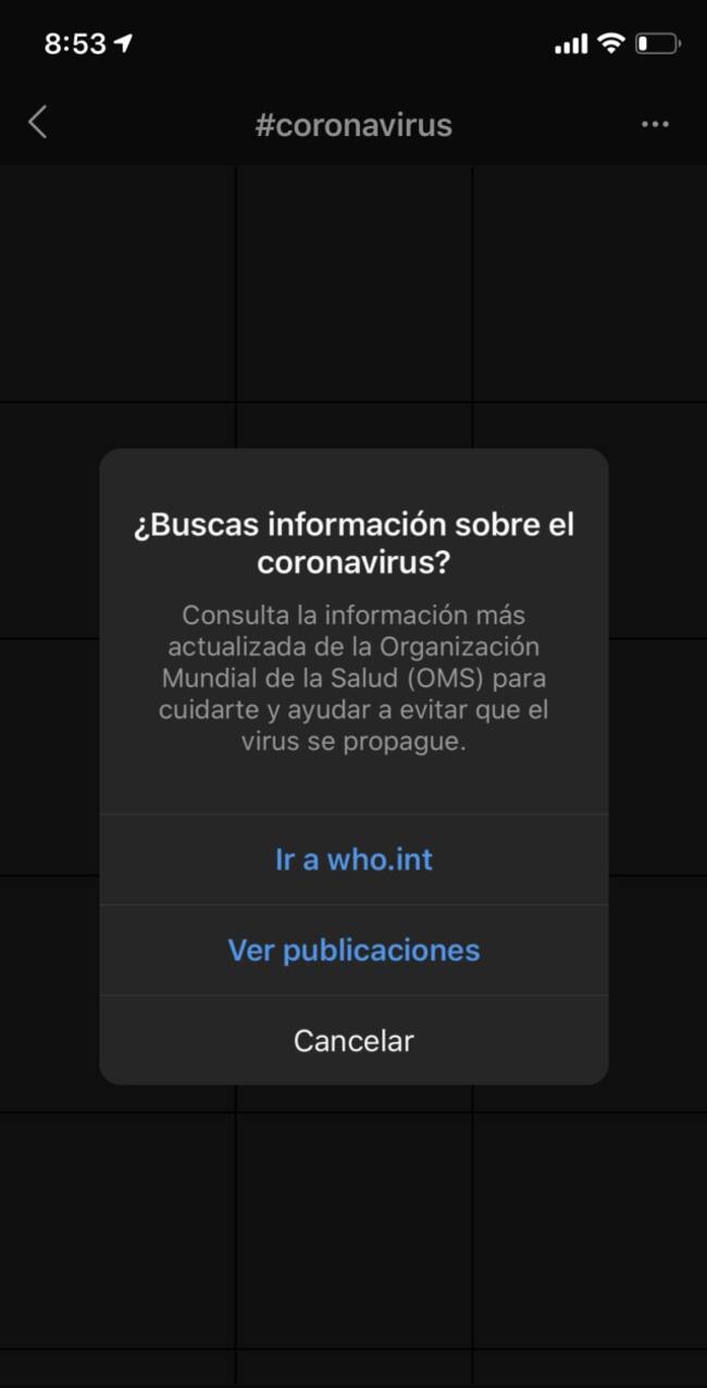 Si usas Instagram, ve al buscador de la aplicación y escribe #coronavirus. Al seleccionar la palabra, la red social te pregunta si deseas más información sobre el virus o si deseas ver publicaciones.