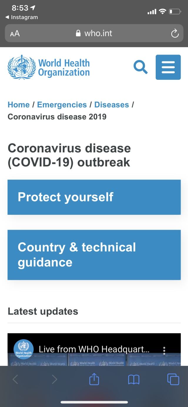 Luego de seleccionar más información, la aplicación te redirecciona hacia la página de la OMS, donde hay información precisa sobre el virus.