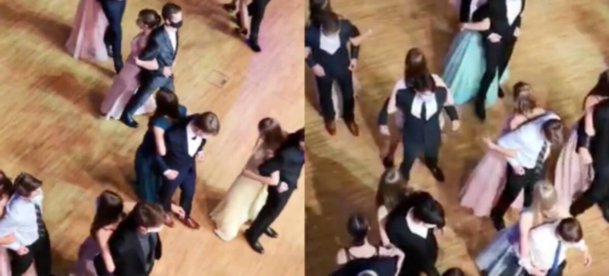 Eso parece que lo aplicaron en un baile de graduación de una escuela. Un video muestra como los jóvenes recién graduados bailan de espalda, pero en pareja, mientras al tiempo usan tapabocas.