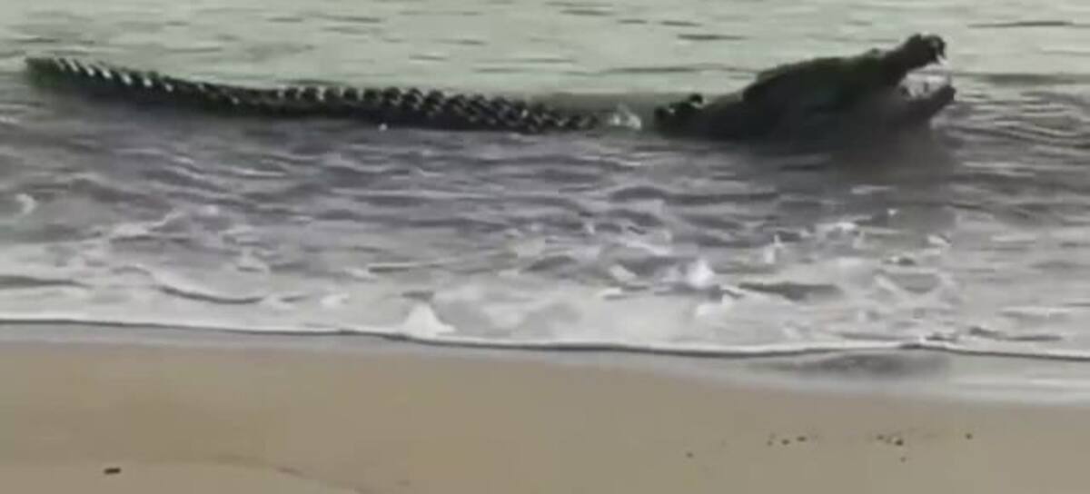 Se volvió viral en las redes sociales un aterrador video en el que se ve la forma en la que un enorme cocodrilo devora a dos tiburones en la costa de Cardwell Beach, Australia.
