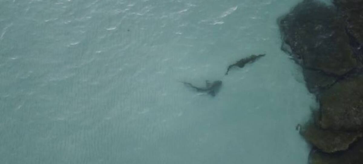 En las imágenes, captadas por el dron de Brotchie el pasado 10 de abril, muestran al tiburón tigre siguiendo al cocodrilo durante unos dos minutos, mientras el reptil intenta subir a unas rocas para ponerse a salvo.