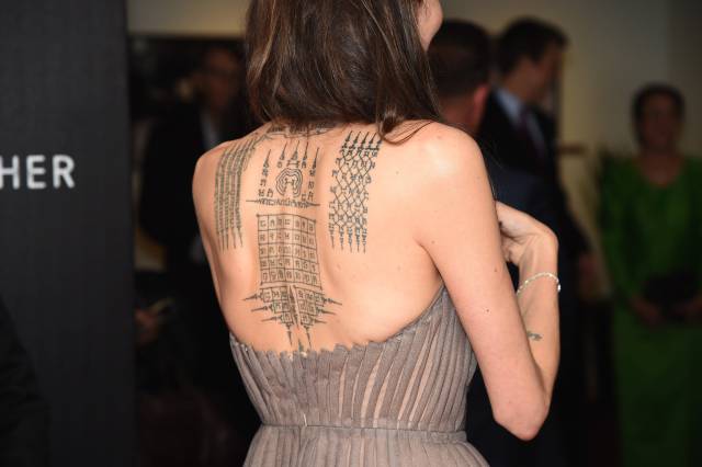 Uno de los tatuajes de la actriz que más llama la atención es el que tiene en toda su espalda, este tatuaje es un ‘Sak Yant’ y se origina en Camboya, de donde es su primer hijo adoptivo, Maddox. Son tatuajes místicos y frases Pali, un lenguaje usado en ceremonias budistas.