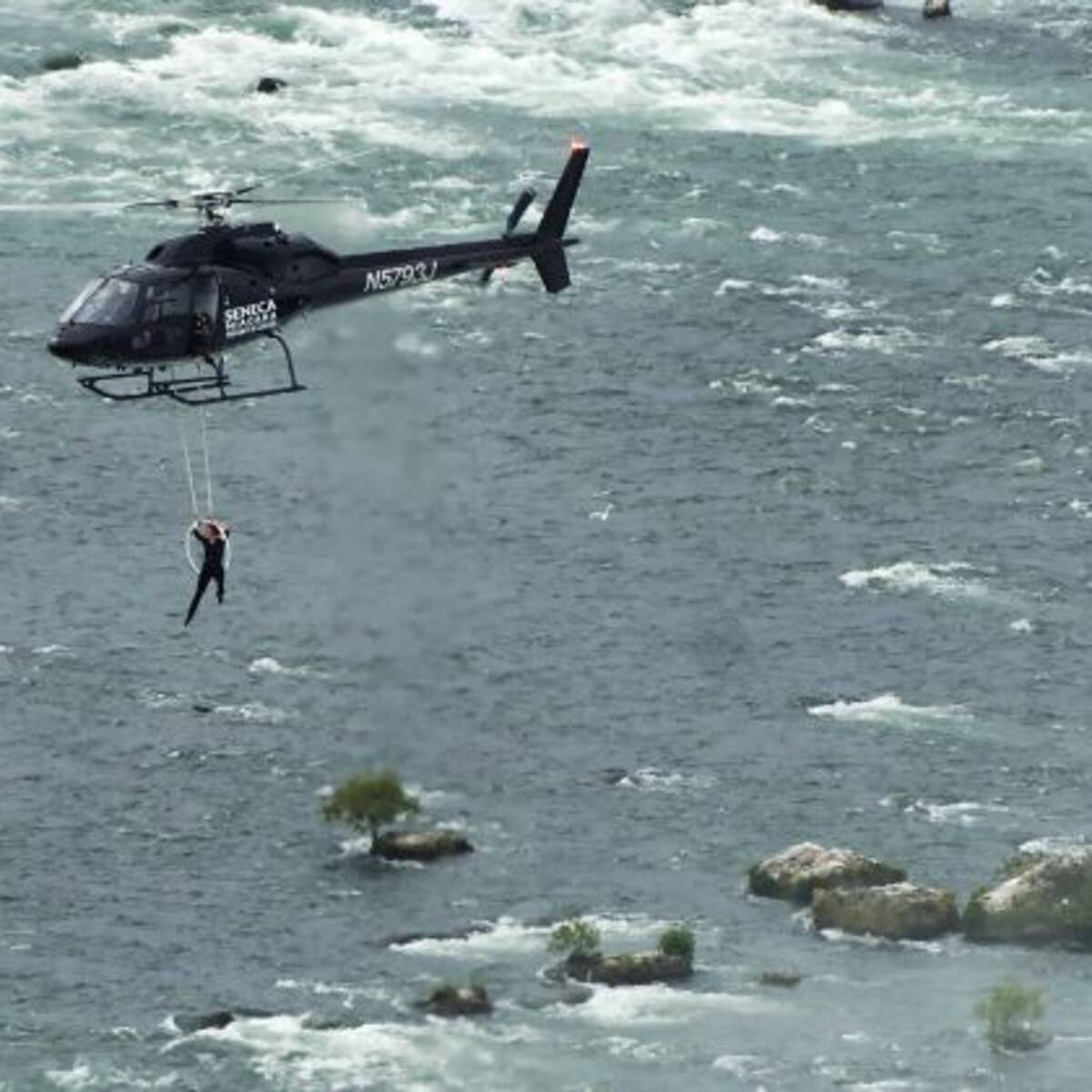 Wallenda, de 36 años, colgó de un par de cables que iban del helicóptero a un aro mediano.